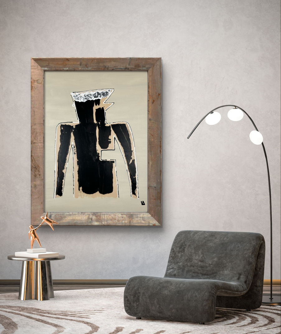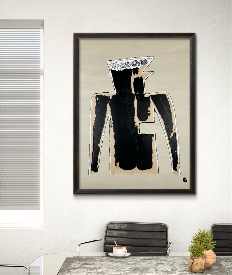 Artwork Inspiration: Roy by IA212 is a deeply personal and evocative piece of contemporary art that captures the turmoil and complexity of a conflicted mind and a disconnected heart. This painting features an abstract silhouette rendered in deep black against a muted beige background. The figure's head is adorned with a textured pattern, symbolizing a complicated and messy state of mind, while the heart area is notably empty, reflecting a sense of disconnection and emotional void.
